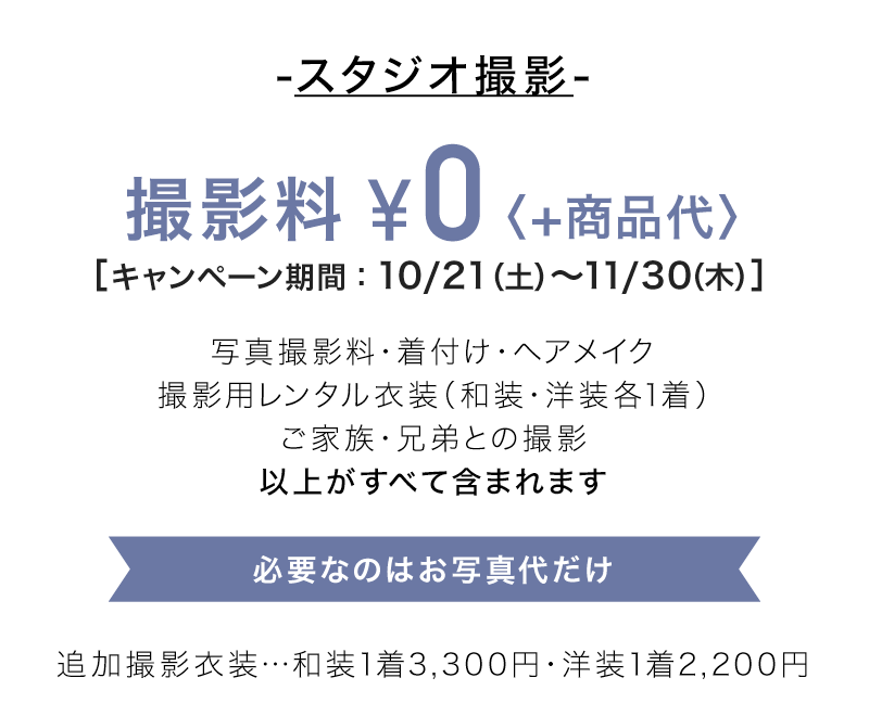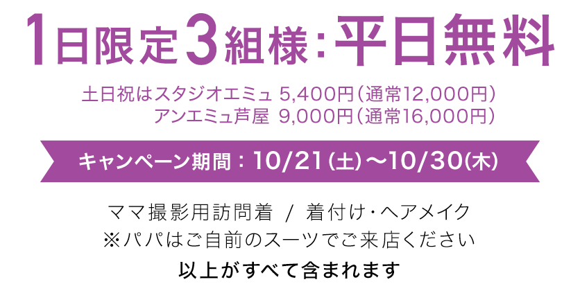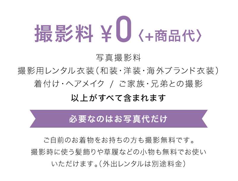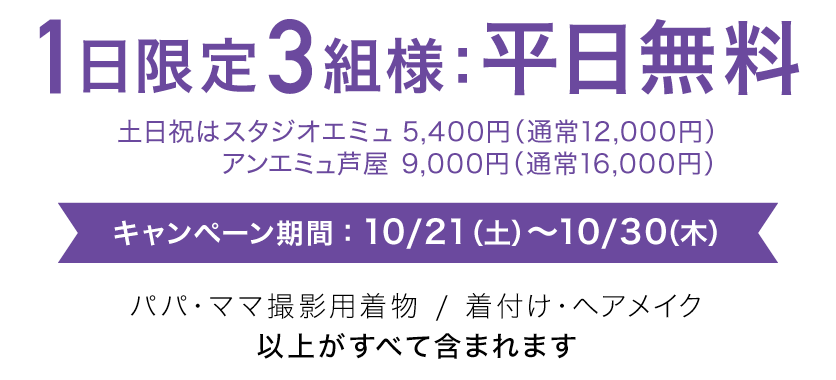 エミュのスタジオ撮影は、定番の着物やドレスはもちろん、他のスタジオでは味わえないプロのヘアメイクや海外のセレクト衣装なども選べる「オシャレな七五三」がいっぱい! さらにスタジオエミュでは、春から初秋にかけて特典がいっぱいの「早撮り」をおすすめしています。
