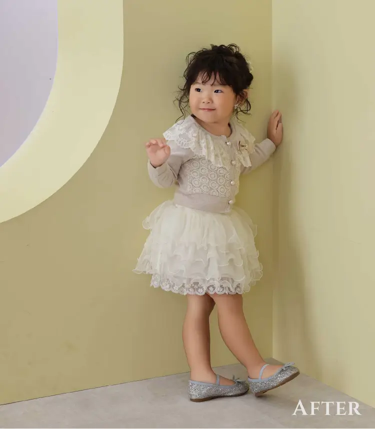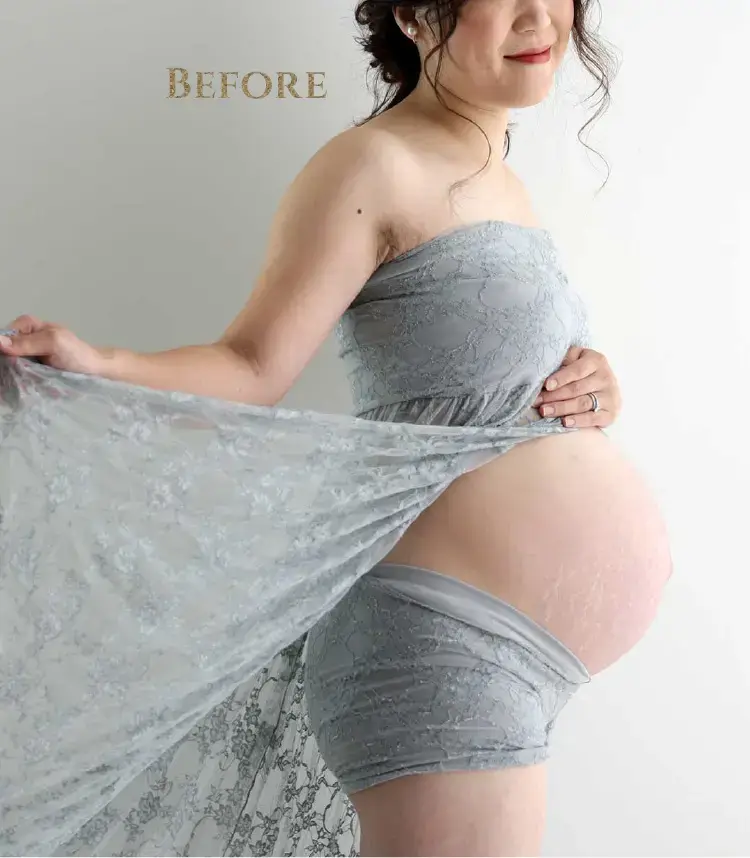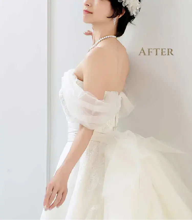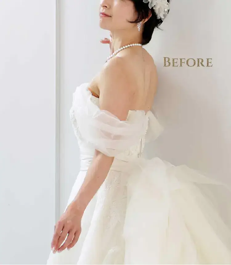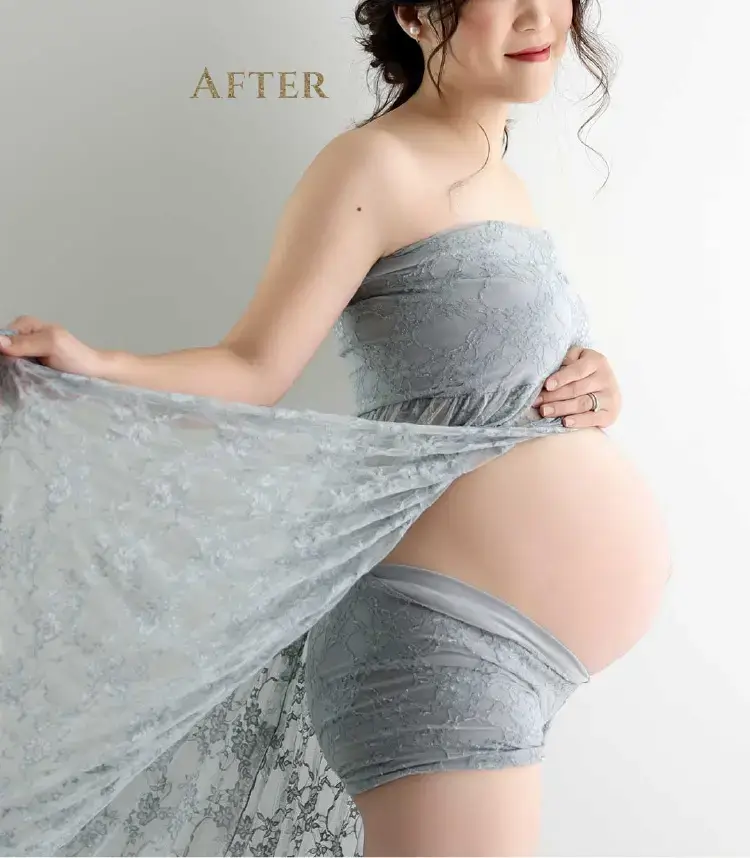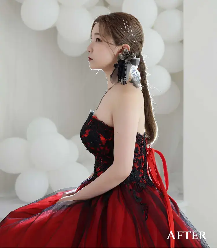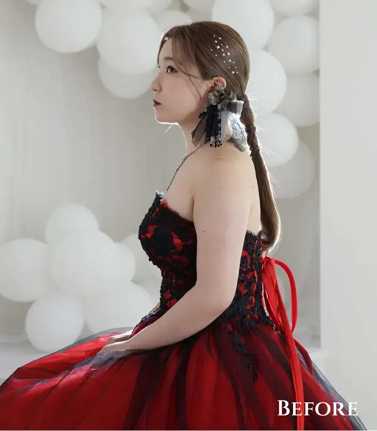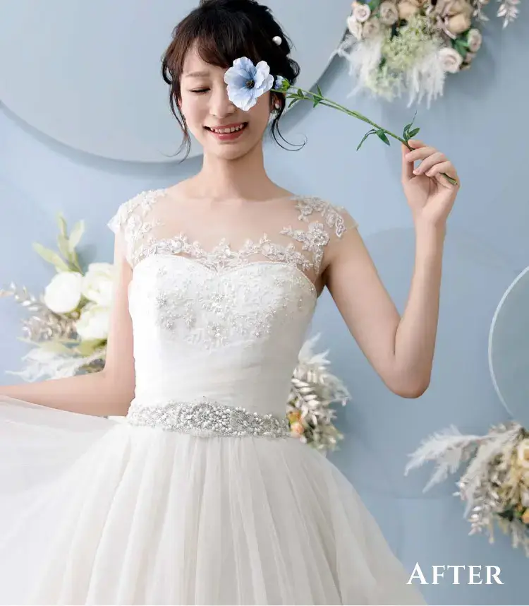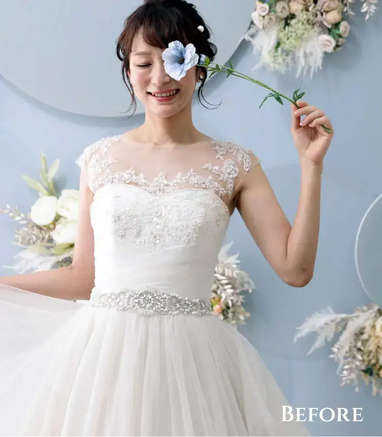 肌荒れ・シワ・傷や痣をキレイに消して、ボディラインを自然にシャープに。二重顎や二の腕の太さも美しく、日焼けした肌もキレイにレタッチできるんです。中でも一番の魅力は加工アプリのような強引な痩身ではなく、ナチュラルなシャープラインにできるところ。一生の思い出になるお写真だから「撮って良かった」と思っていただけるお写真を提供したい!そんな思いで始めました。