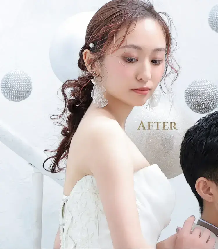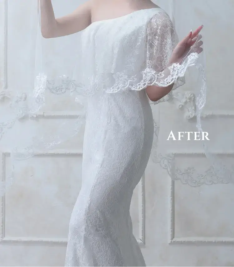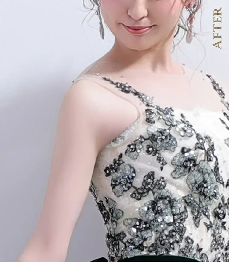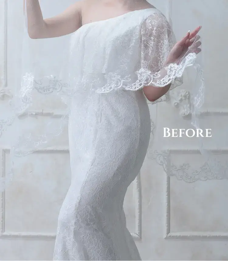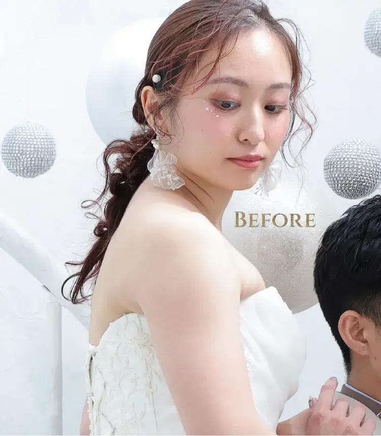 肌荒れ・シワ・傷や痣をキレイに消して、ボディラインを自然にシャープに。二重顎や二の腕の太さも美しく、日焼けした肌もキレイにレタッチできるんです。中でも一番の魅力は加工アプリのような強引な痩身ではなく、ナチュラルなシャープラインにできるところ。一生の思い出になるお写真だから「撮って良かった」と思っていただけるお写真を提供したい!そんな思いで始めました。