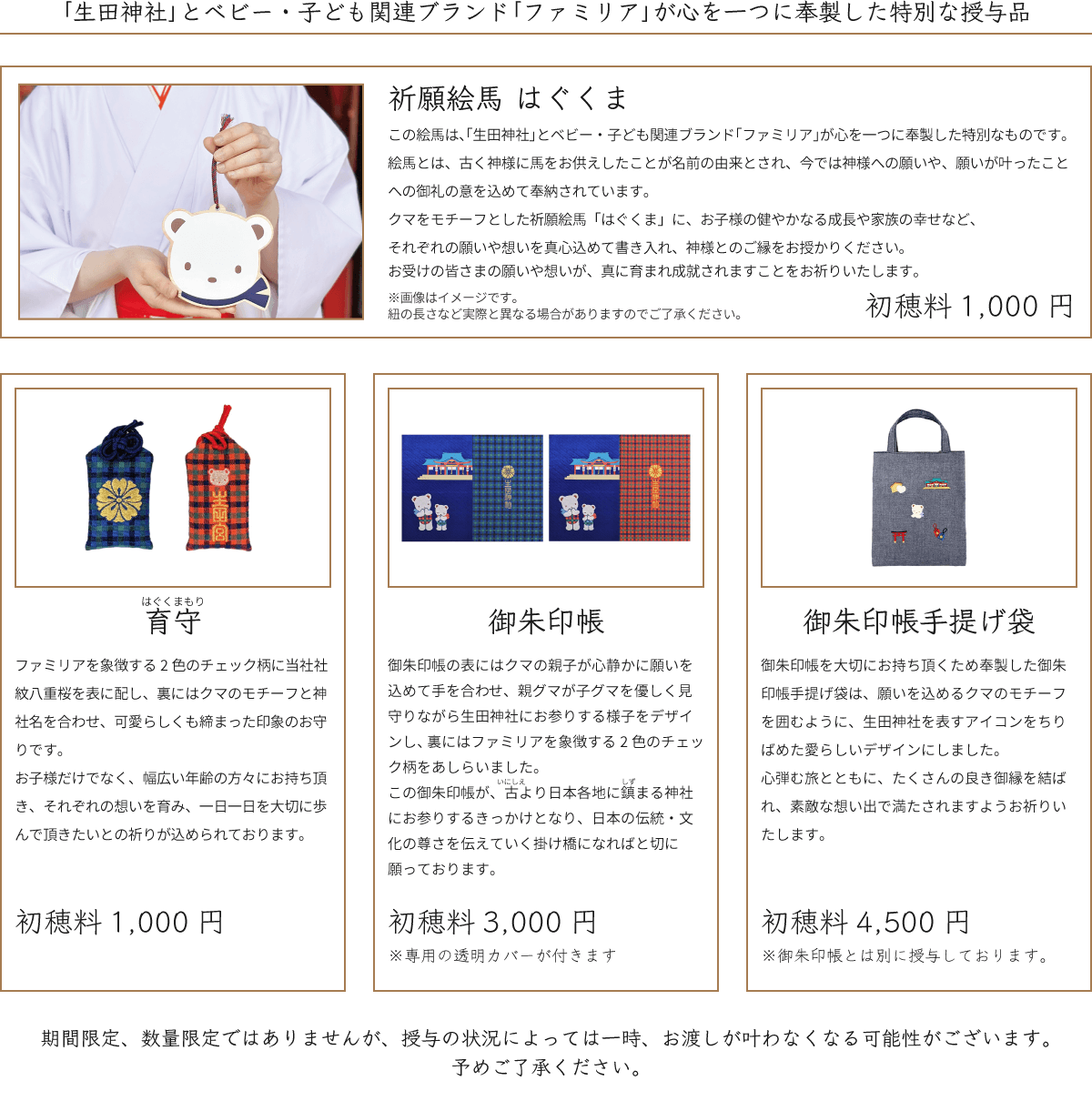 生田神社は、神戸に本社があるベビー・子ども服の人気ブランド「ファミリア」のグッズがもらえるなど、以前からファミリアとの関わりが深い神社ですが、2021年からはファミリア×生田神社コラボのお守り「育守(はぐくまもり)」がもらえることでも大人気です。