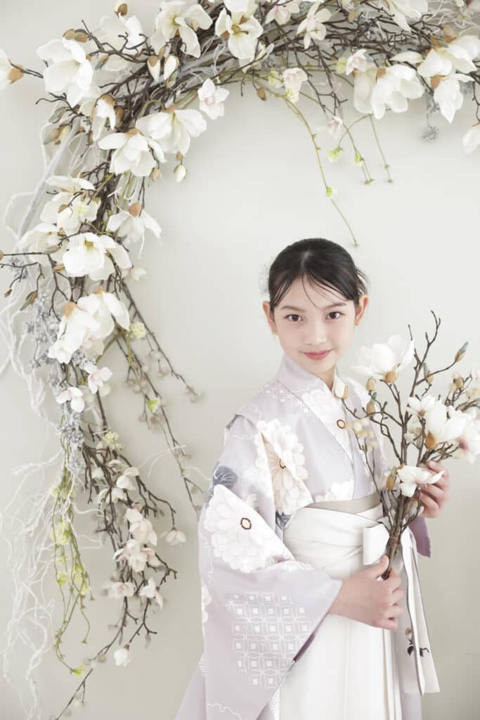 着物は柄、袴は無地で引き算。髪飾りで個性を足せる。