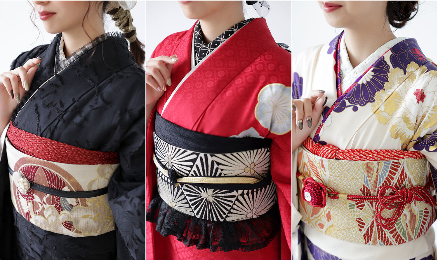 赤い振袖なら金や白の帯で華やかさを演出。青い振袖には、シルバーや淡いピンクの帯でクールビューティーな印象に。色の組み合わせであなたの個性が輝きます。