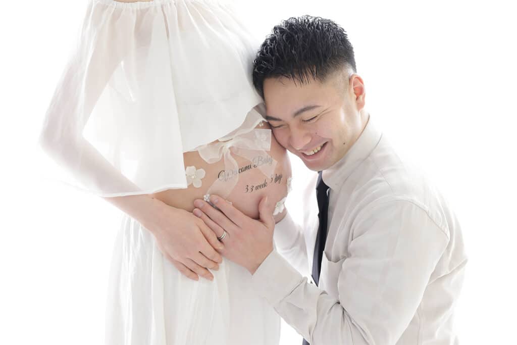 スタジオエミュでは、パパの魅力を引き出すポーズや撮影アングルにもこだわっています。ママを後ろから優しく包み込むポーズや、横顔で見つめ合うショットなど、それぞれのカップルの雰囲気に合わせてご提案します。