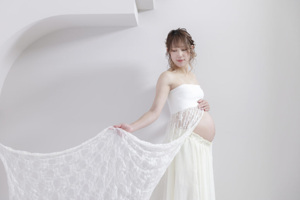 妊婦さんのためにデザインされたマタニティドレスは、妊娠中の特別な瞬間を美しく演出してくれます。なかでも、白い生地に繊細なレースが施されたデザインは、妊婦さんの母性と美しさを際立たせるのに最適です。お腹の赤ちゃんとともに、優雅な雰囲気を醸し出せるでしょう。