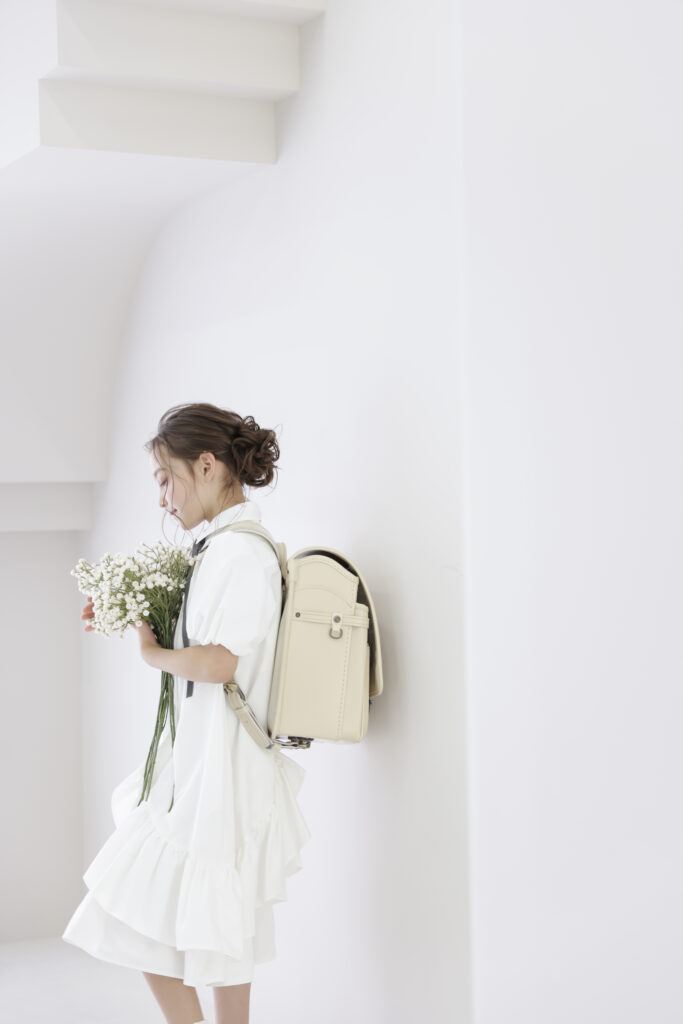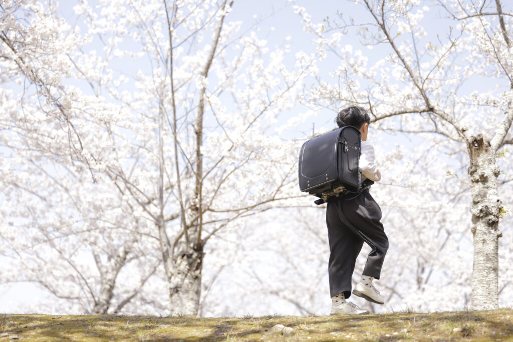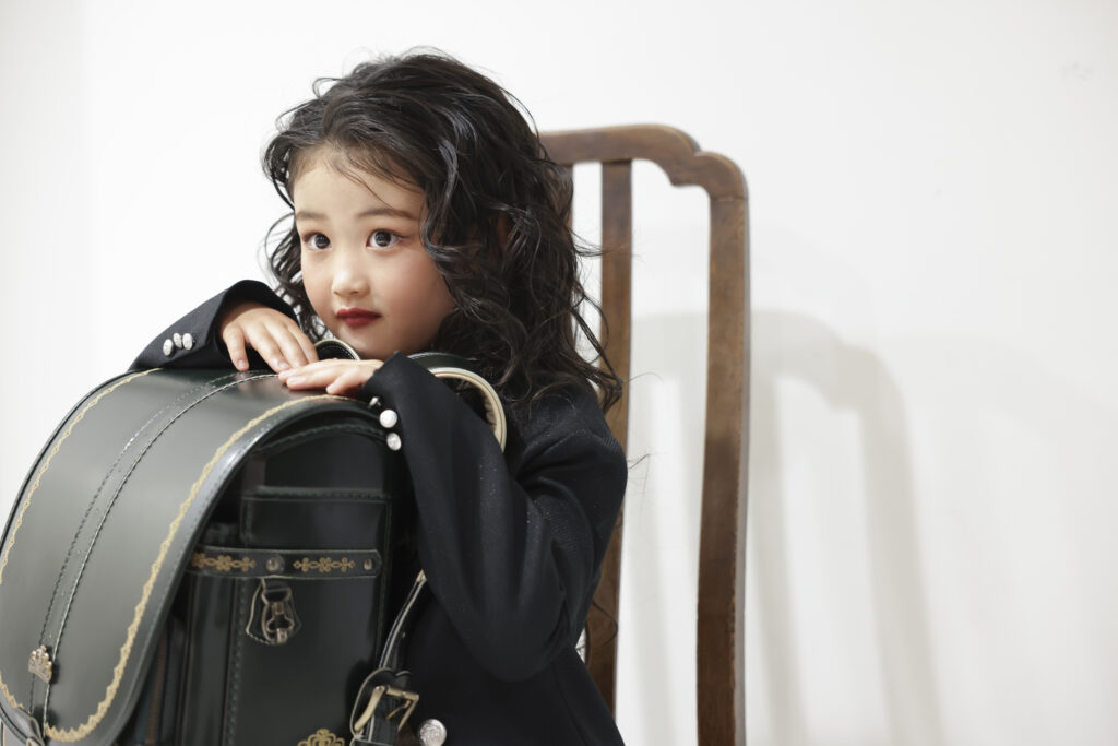 身体を斜めにして後ろから振り向くように撮影してみると、ランドセルとお子さんの顔がよく見える写真になります。