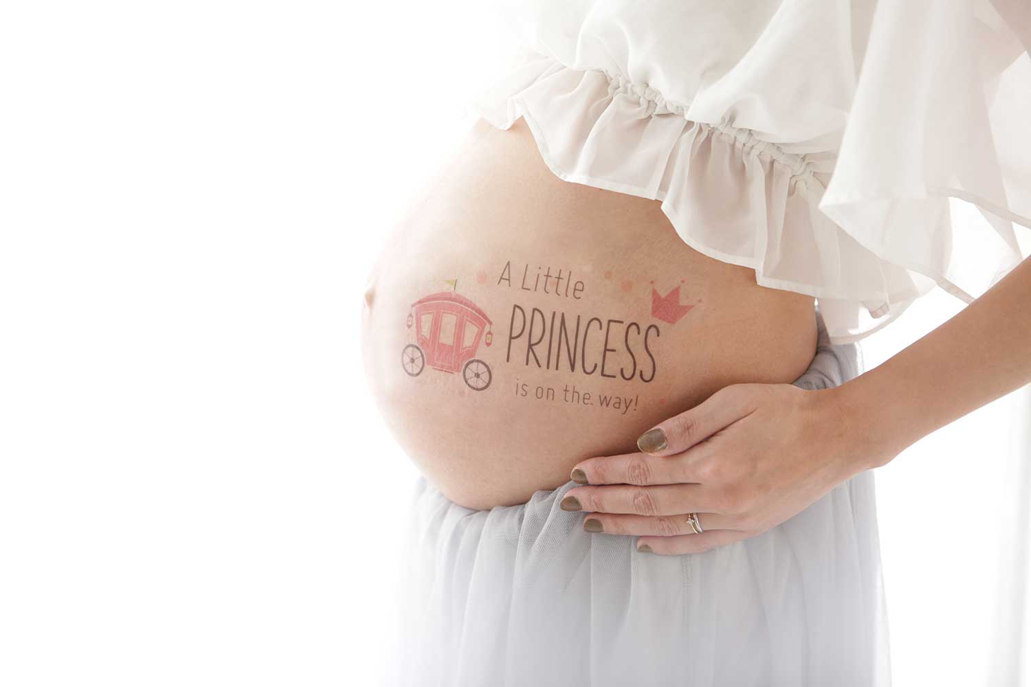.スタジオエミュでは、ベリーペイントよりも気軽に体験できる「ベリーペイントシール」でお腹にペイントを施すことが可能です。ベリーペイントシールは貼るだけなので手間がかからず、撮影までスムーズに移行できます。