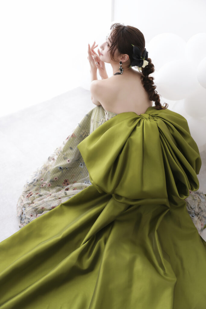 「平和」や「生命」といった意味を持つグリーンのカラードレスは、ゲストに癒しをもたらすでしょう。