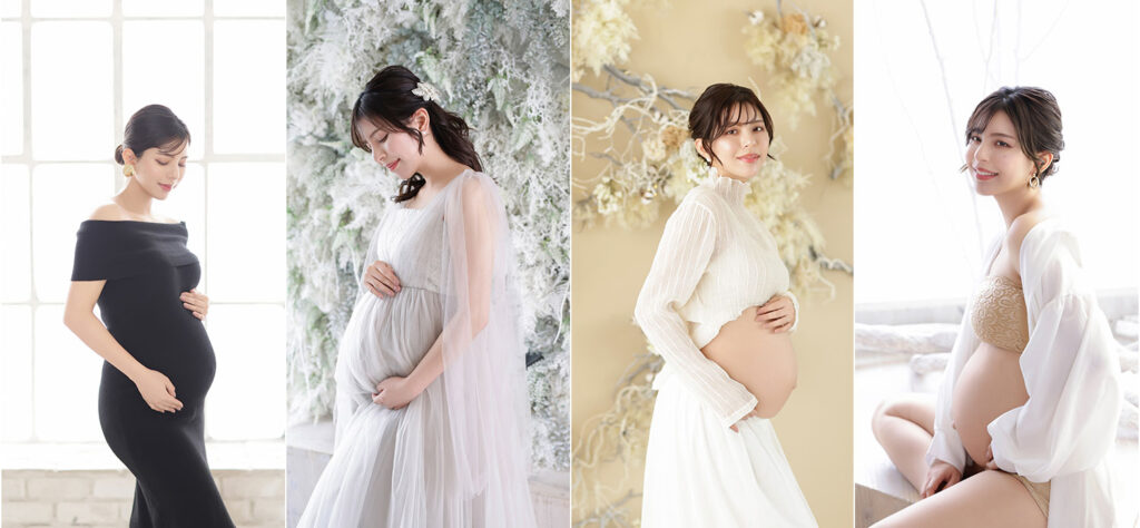 衣装選びどうしよう…と、悩んでいませんか?大丈夫です。スタジオエミュでは多彩な衣装をご用意しております。まず、マタニティフォトに適した衣装のタイプを見ていきましょう。