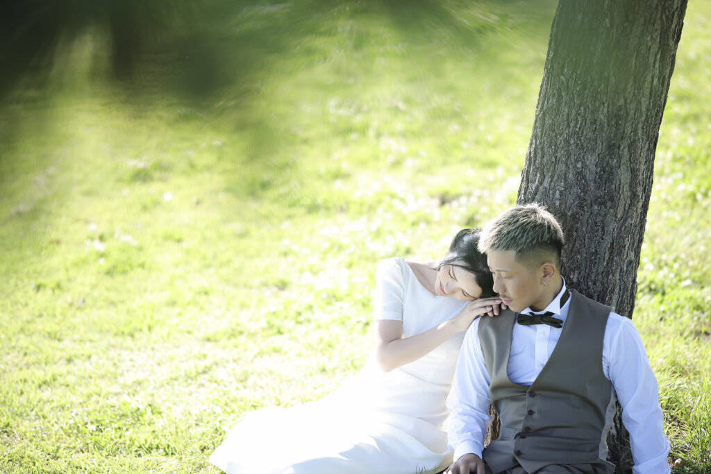 木々の間から差し込む光を利用して、幻想的な雰囲気を演出できます。大きな木の幹に寄り添うポーズなど、自然と一体になるような撮影が印象的です。