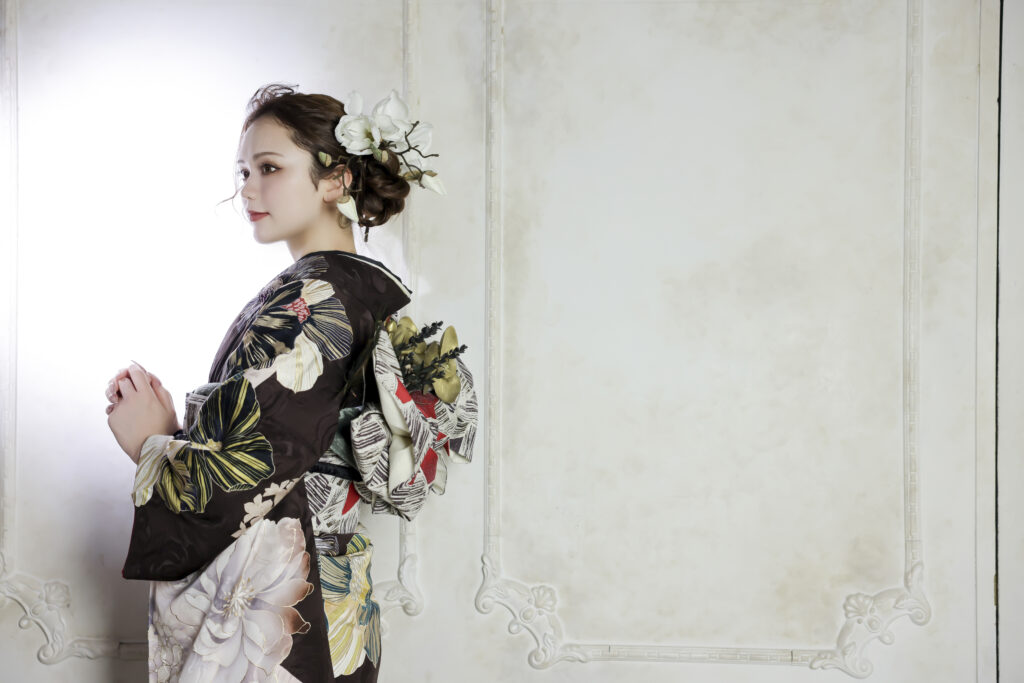 黒振袖の魅力を最大限に引き出すには、背景選びが重要です。スタジオ撮影なら、季節や天候に左右されず計画的に撮影できるのが利点。