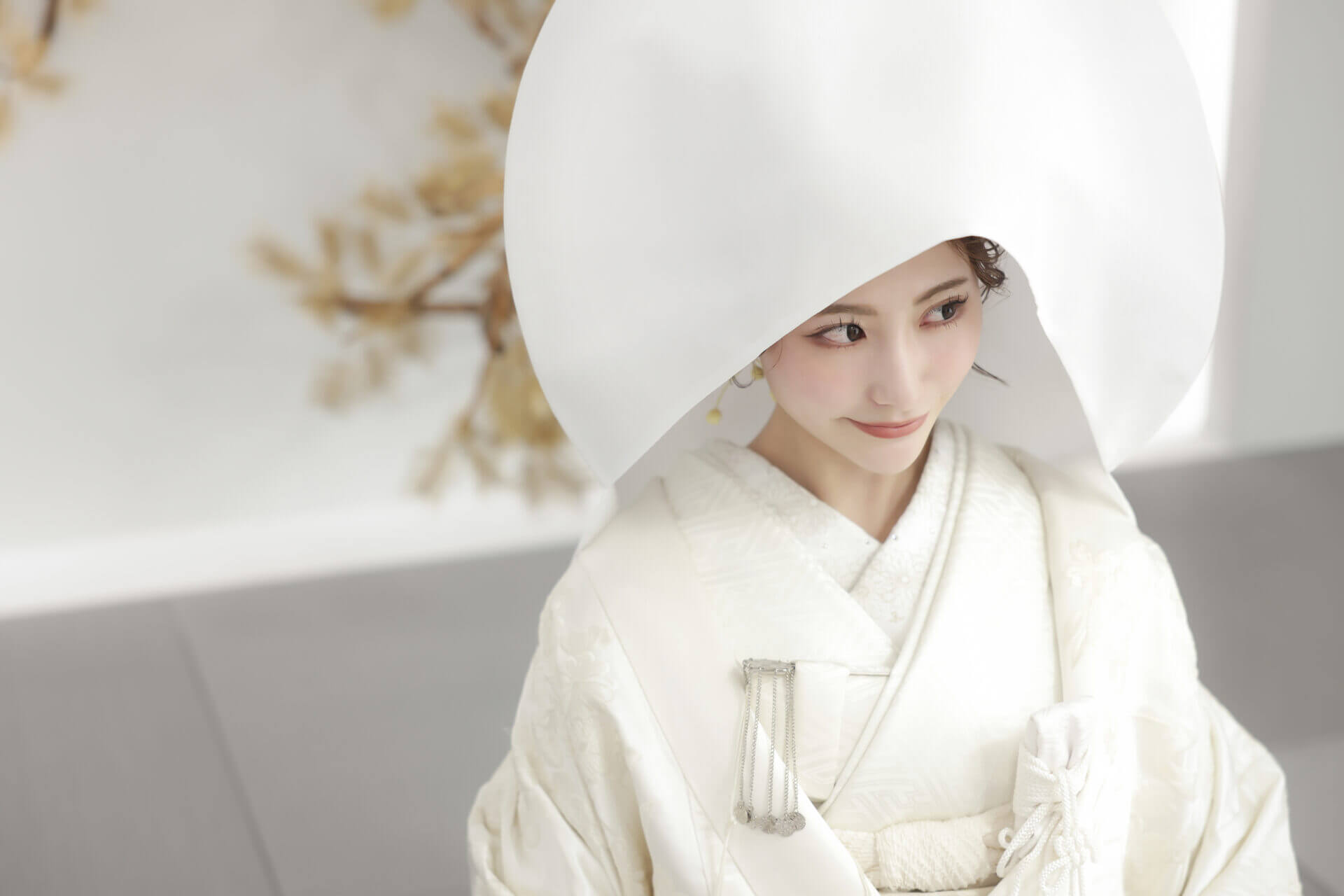 白無垢姿で撮影された写真を見てみましょう。純白の装いは花嫁の清らかさと新たな人生への希望を象徴しています。その白無垢に合わせた華やかな打掛はまるで蝶が羽を広げたかのように、花嫁の美しさを引き立てます。これらの伝統的な衣装が現代的な撮影技術と融合することで、まさに時を超えた美しさが生まれるのです。