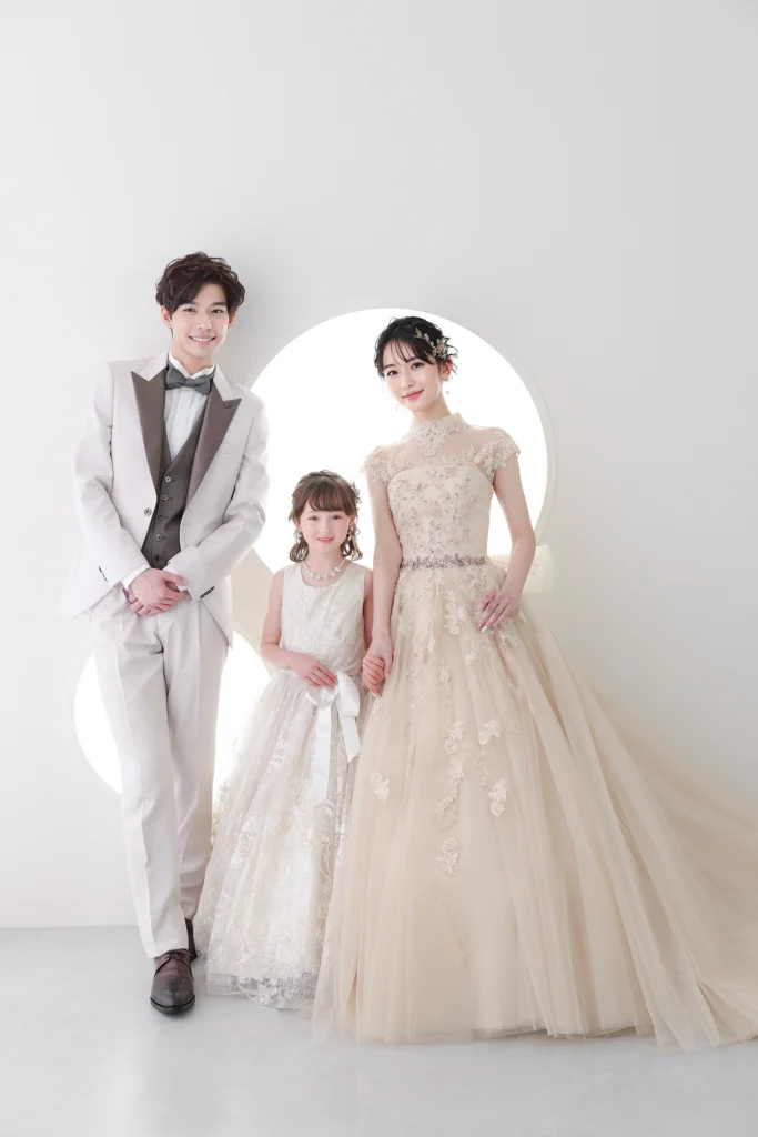 一方でお母さまはウェディングドレス、お父さまはタキシード、お子さまはミニドレスやスーツ…。