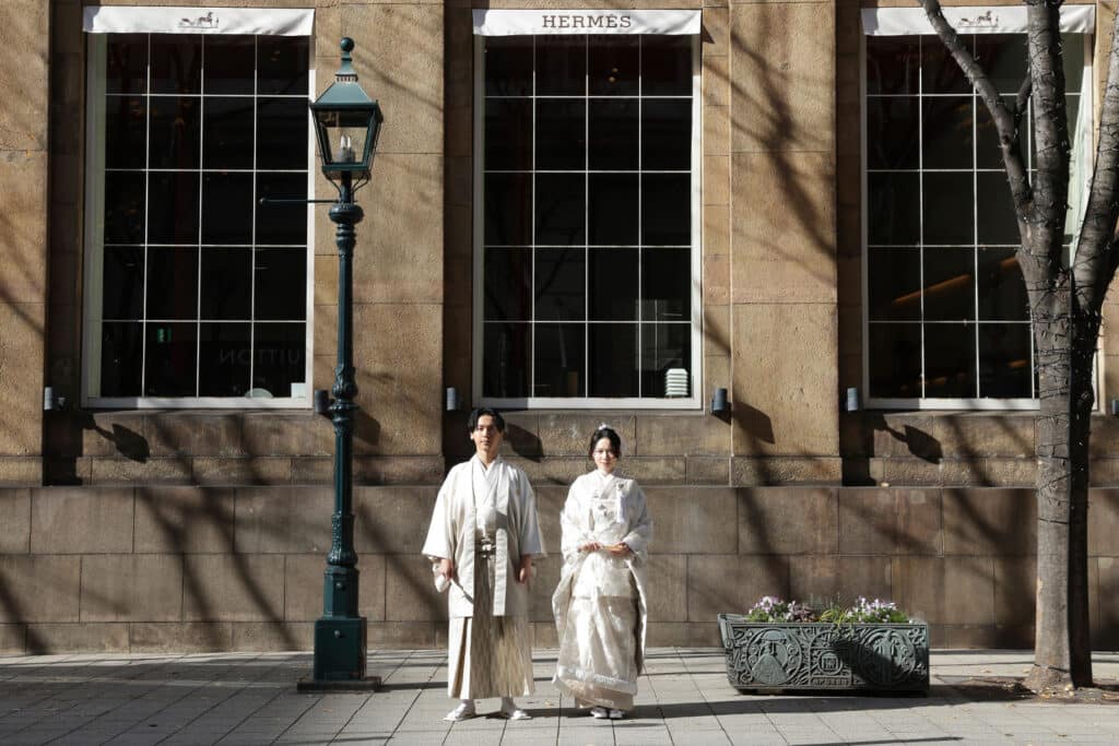 レトロな洋館を背景、艶やかな白無垢姿の花嫁と羽織袴姿の花婿。日本の伝統衣装と西洋建築のコントラストが、神戸ならではの独特の雰囲気を醸し出します。歴史と文化が交差する場所で撮影することで時を超えた愛の物語を表現できるんです。