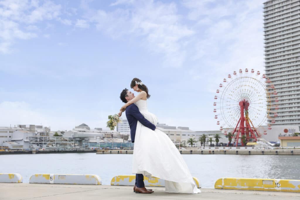 ロケーション撮影のメリットは、季節感のある背景や2人の思い出の場所など好きなスポットで撮影ができることです。しかし、気候やその日の天気に影響される点がデメリットに挙げられます。また、撮影場所によっては周囲に人がたくさんいることもあるため、撮影に集中できないことも考えられるでしょう。
