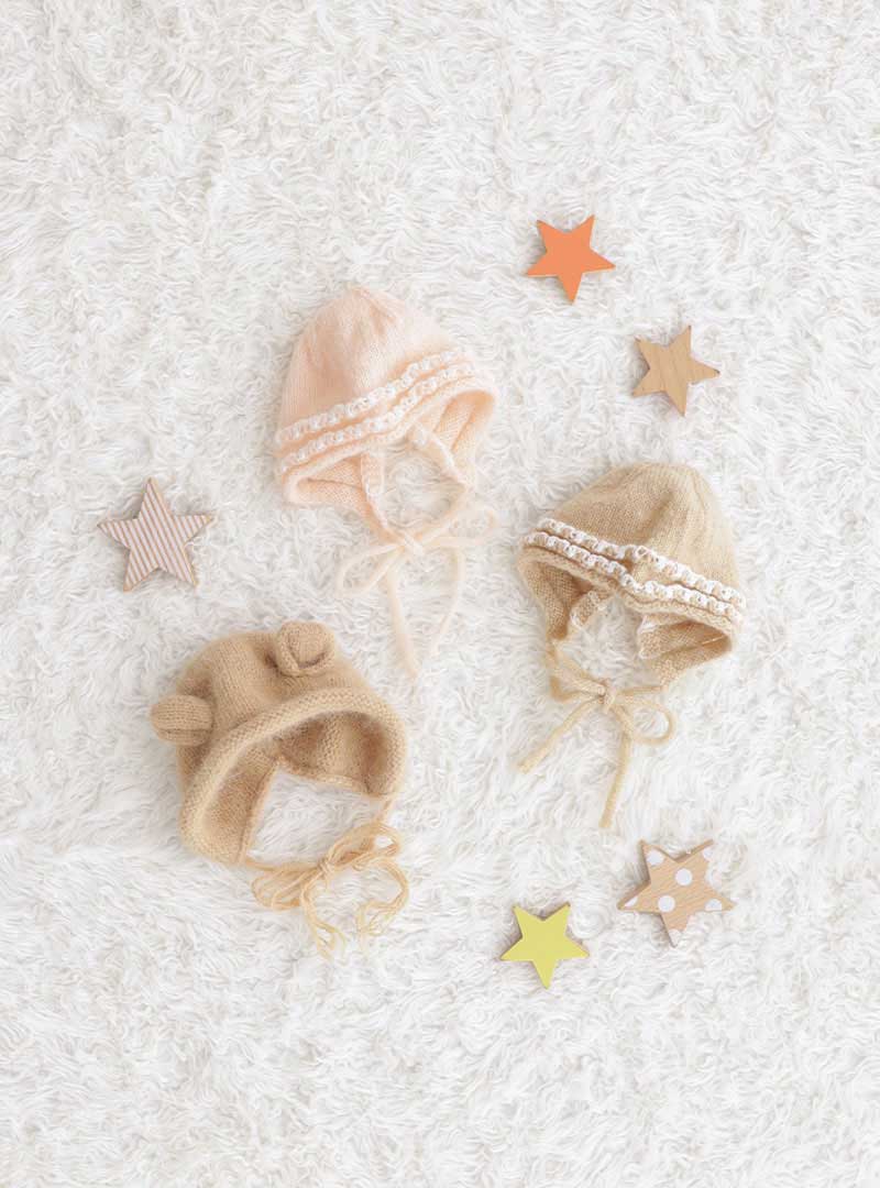 ベビーピンク、ベージュ、ライトブラウンのニット帽子。柔らかいニット素材で赤ちゃんの小さな頭を優しく包みます。ベビーピンク、ベージュのニット帽子は色違いデザインで双子のおそろいコーディネートとしてもお召しいただけます。 くまさん帽子は、色違いのグレーデザインもあるのでこちらもお揃いコーディネートが可能です。