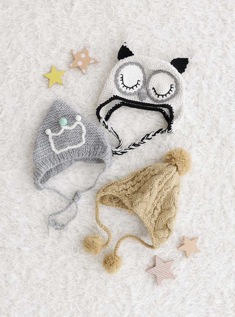 白黒グレー、モノトーンのフクロウを模したデザインの帽子は男の子をちょっぴり可愛らしくするアイテム。ポンポンの付いたデザインのベージュのニット帽とグレーカラーの三角とんがり帽子は可愛いらしいデザイン。記念写真をもっと特別にしてくれる、撮影にぴったりな小物たちです♪
