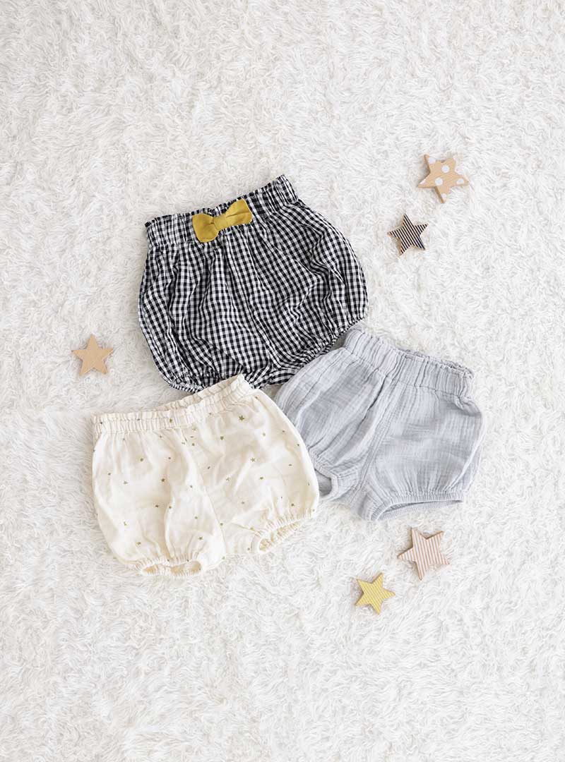 ギンガムチェックのイエローリボンが可愛いベビーパンツ、オフホワイトの星柄のベビーパンツ、ライトグレーのシンプルなベビーパンツです。かぼちゃパンツタイプのシルエットで赤ちゃんらしい可愛いパンツです。 よちよち歩きができるようになった1歳前後の赤ちゃんに着用いただけるサイズ感なので1歳バースデーフォトのONE Tシャツと合わせてコーディネートするのもおすすめです。