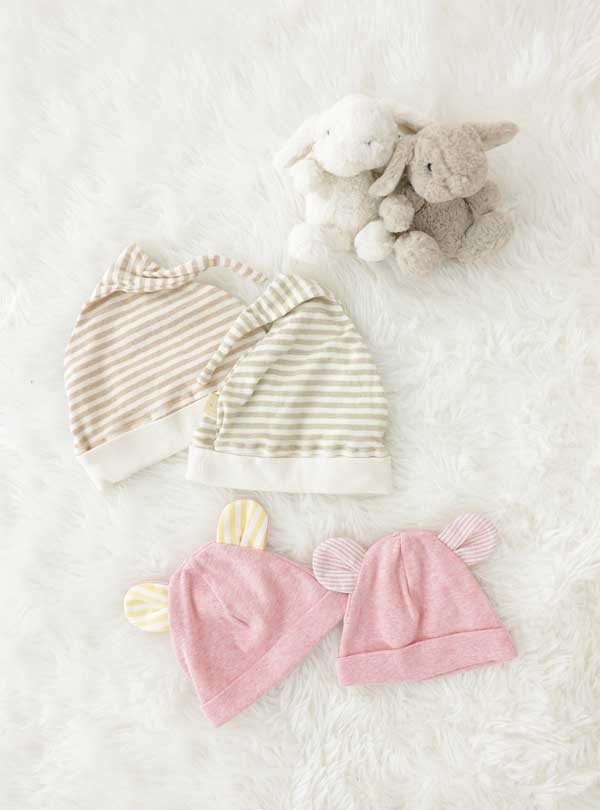 シンプルなボーダー柄の帽子と、耳付きのピンク帽子が2種類含まれており、それぞれ異なる雰囲気を楽しめます。ナチュラルなカラーリングと愛らしいデザインが、赤ちゃんの柔らかな表情や個性を引き出し、写真に温かみを添えます。これらの帽子は、さまざまなスタイリングに対応でき、赤ちゃんの魅力を際立たせる素敵なアクセントとなるでしょう。