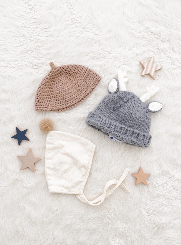 ベビー撮影にぴったりな、ユニークで可愛い帽子コレクション。どんぐりのようなまるいニット帽、トナカイ風のツノ付きデザイン、ポンポンがちょこんと乗ったさんかく帽子など、どれも写真映えバツグン! シンプルな背景にもよく映えるので、赤ちゃんの愛らしさがぐんと引き立ちます。撮影シーンをもっと楽しく、もっと特別に演出してくれる“主役小物”として活躍してくれます♪