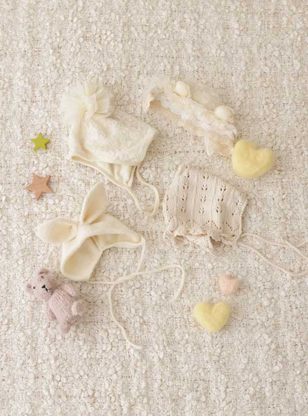 1ヵ月~3ヵ月のお子様に使用できる白を基調とした帽子です。淡い背景にピッタリで赤ちゃんらしく可愛らしい姿を残すことができお宮参りのはだかんぼ撮影のアイテムとして使用します。