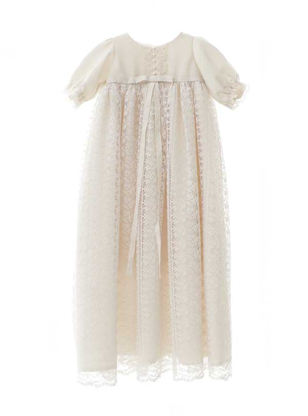 落ち着いたベージュの色味にレースが可愛らしいドレスです。サラッとした生地感で胸元にはレースとパールがデザインされており、ふんわりとした袖のデザインも可愛らしい印象です。スカート部分は透け感のあるレースが重なったており上品でナチュラルな雰囲気です。ベージュトーンのナチュラルなデザインが好きな方におすすめです。