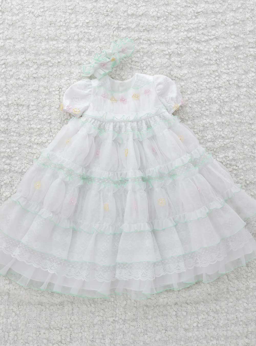 白、ピンク、黄色、黄緑のカラフルな色味のドレスです。レース部分は緑と白のフリルで仕上がっており、ピンクと黄色の花部分は可愛らしい雰囲気のデザインです。袖口には花の刺繡が施されており、全体的にボリュームがあるデザインです。セットのヘッドアクセサリーもドレスと同じデザインでフリフリがとても可愛らしい印象です。