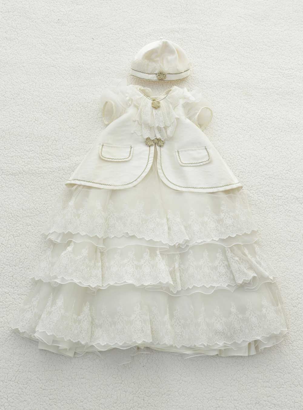 男の子に大人気の王子様風ベビードレス。ベビードレスには少し珍しい、ジャケットを着ているように見えるかっこいいデザインですが、裾のレーススカートや袖のシースルーが可愛さをプラス。 セットの帽子があるので被れば王子様の出来上がり!被ってない時は他のヘッドアクセもご準備しております。スタジオ背景は白やふんわりとしたナチュラルに撮れる場所と相性抜群です!