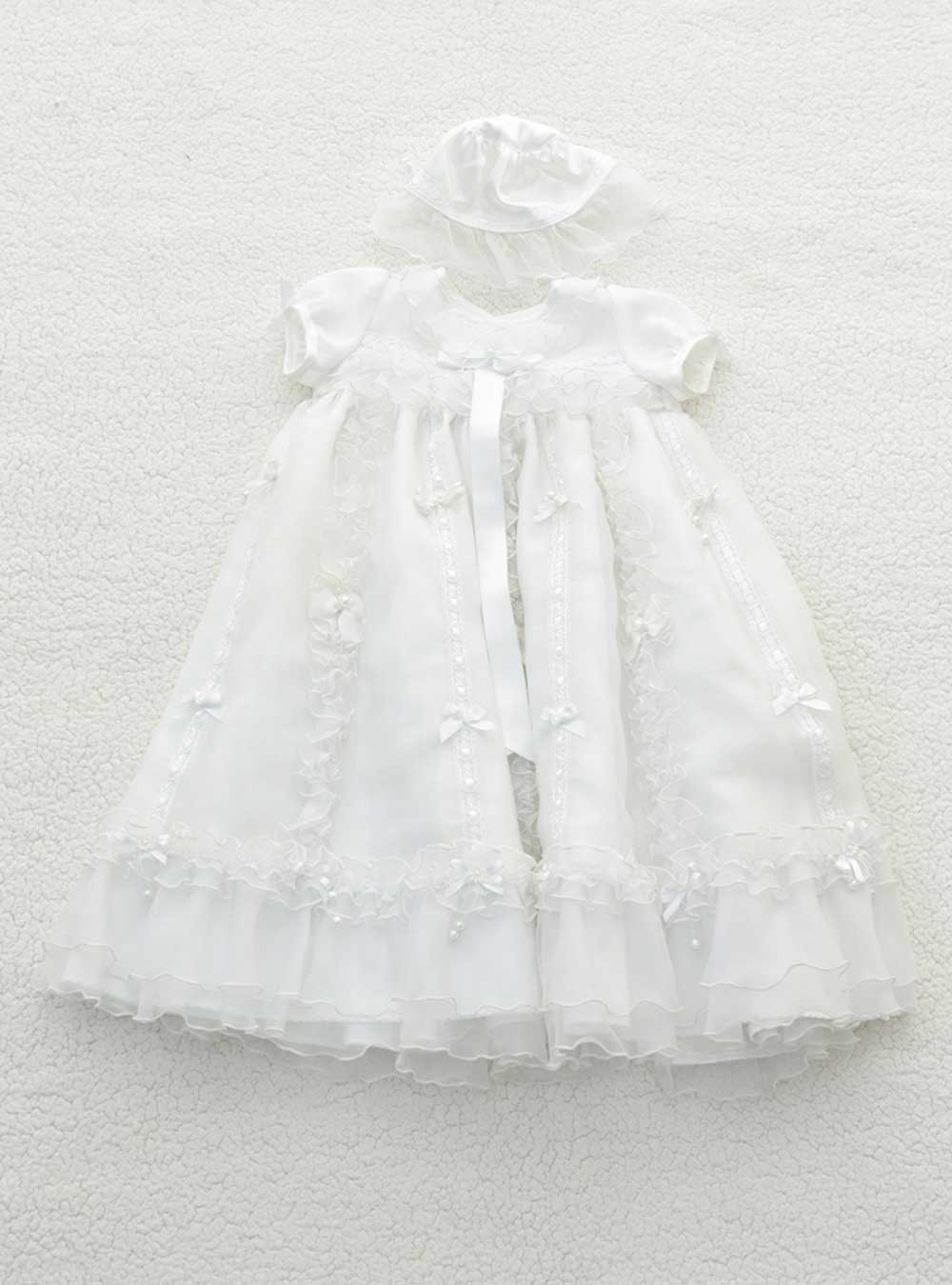 艶のある真っ白な生地にオールホワイトの装飾が上品なベビードレス。胸元の大きく流れるリボンに加え全体にも無数のリボンとパールの装飾が散りばめられています。純真無垢の象徴とされる「ホワイト」のベビードレスは、お宮参りで神様にお参りする際に最適な正装であると言われています。 近年では、オフホワイトや淡い色味のドレスでお参りする事も増えていますが、ホワイトのドレスにすることで赤ちゃんの顔も抱っこするママの顔も明るく見せてくれる嬉しい効果もありおすすめです。