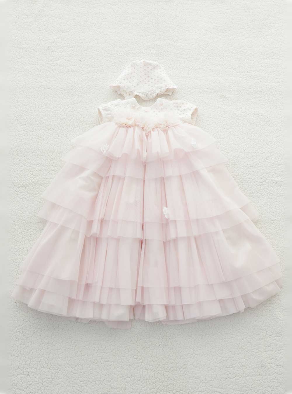 可憐で愛らしいふんわりとしたデザインの一着です。異なる長さのフリルが重なり立体感を生み出しており、淡いピンクのチュールとのハーモニーがふんわりとした上品な可愛さを演出します。 襟元には華やかな花のモチーフが施されており、トップには種類の違うレースが使用されていることによってシンプルなドレスに一層豪華さを加えています。