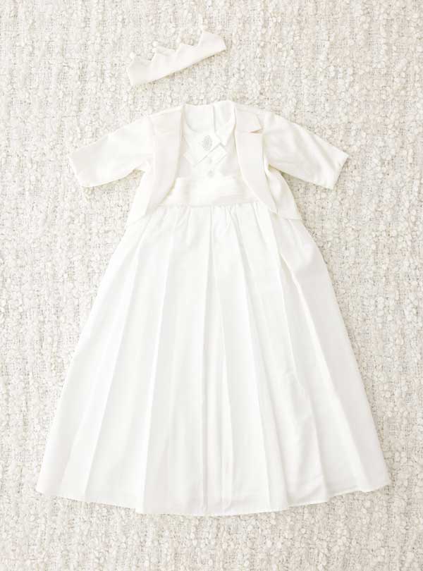 フェミニンなデザインが多いですがこちらはタキシード風デザインで男の子にとくに人気です。オーガンジーのドレスにボレロ風の王室の王子スタイル。シンプルながらに華やかさもあり、顔周りはスッキリしたデザインです。 胸元の飾りがワンポイントでキラッと輝きを放ち可愛らしさも兼ね備えた1着です。