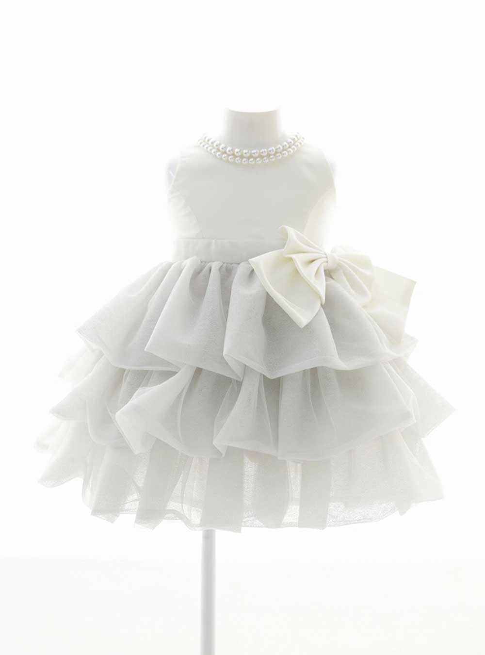 ふわりと幾重にも重なったスカートが、まるで雲のように軽やかなドレスです。お子さまの動きに合わせて優しく揺れるたびに、柔らかな光をまとってきらめきます。主役の笑顔を引き立てる純白の色合いと、華やかで愛らしい大きなリボンも魅力的。バースデーという特別な一日に、このドレスを着て楽しそうにはしゃぐ無邪気な一瞬を、ぜひ素敵な記念写真として残してあげてください。