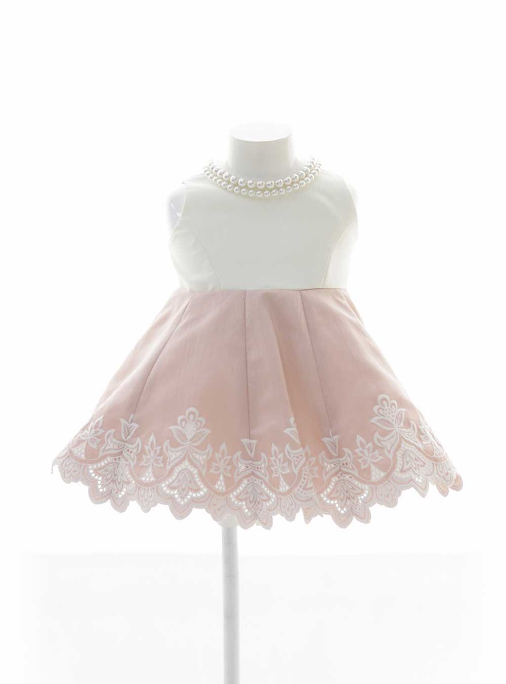白とピンクの組み合わせが女の子らしくて可愛いドレス!他のドレスとは違ってスカートの裾が刺繍の柄に合わせて花びらのようにポコっとした形になっているのがポイント! 胸元のパールは一気に顔をパッと華やかにできる素敵なアイテム♪パールが二層になっているのも華やかで素敵です!シンプルなスタジオ背景が良く似合います♪