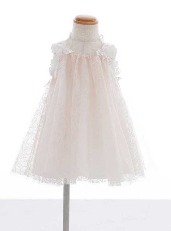 ピンク地×ホワイトレースのシンプルドレス。全体にホワイトレースが施され、肩からスカートにかけて緩やかなAラインに広がる形になっていています。肩には控えめなフリルがありシンプルながらも、可愛く柔らかな印象を与えます。 肩のスナップでサイズ調節が可能です。