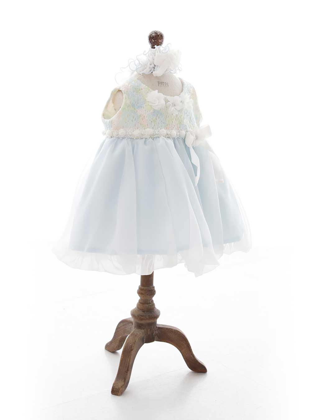 さわやかなブルーとお花がデザインされた女の子らしいドレスです。全体的に淡くふんわりとした色味でボリュームがあるレースのスカート部分がとても可愛らしい印象です。 ドレスタイプなのでお座りできる子におすすめです。ウエスト部分のリボンもポイントです。可愛らしい雰囲気が好きな方におすすめです。