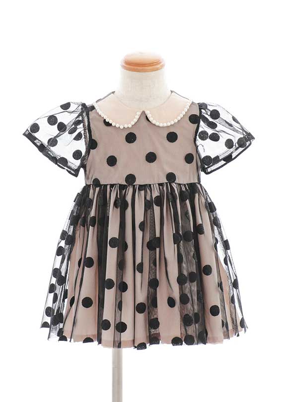 シックでクラシカルな魅力を放つ一着です。柔らかなベージュ地に大きな黒のドットがアクセントとして施されており、モダンで洗練された印象を与えます。 袖部分には透け感のある黒い生地が使用され、軽やかさとエレガンスさを両立させています。このドレスは特別なイベントにピッタリです。