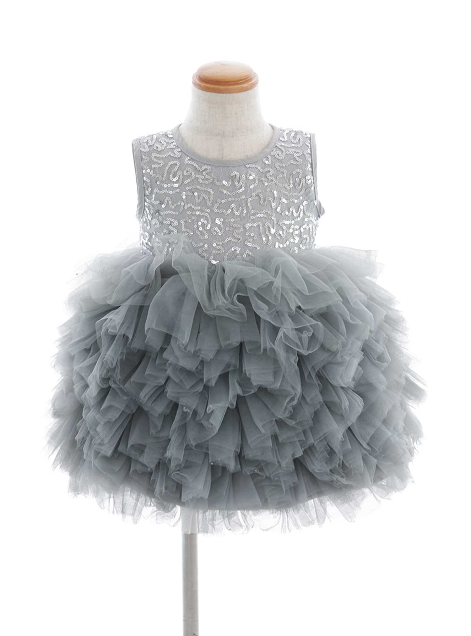 グレーカラーにスパンコールのキラキラが綺麗に光る上品かつキレイなドレス。キラッと光るキレイさはもちろん、スカートは段が細かめのフリフリ仕様♪ 他のドレスよりスカート丈が短めなので、赤ちゃんらしい可愛いムチッとした足首がしっかり見える魅力的なデザインになっています。360°フリフリなので後ろ姿もとっても可愛いです♡
