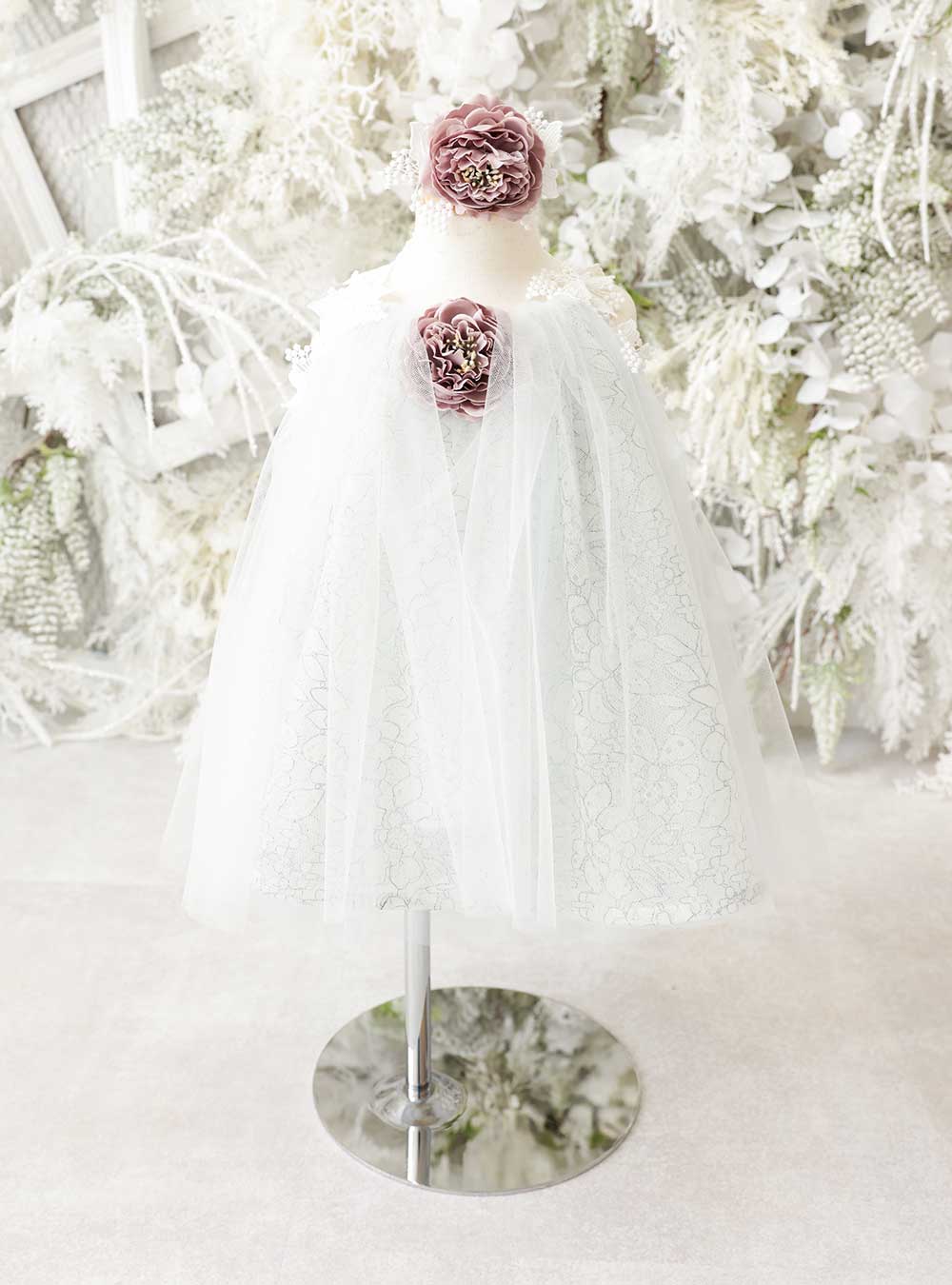 上品さと華やかさが見事に調和した一着です。淡いパステルカラーのチュールがふんわりとしたシルエットを作りだし、まるで天使のような優雅さを演出します。 背面には大きな花飾りがあしらわれており、シンプルなデザインにアクセントを加えつつ、愛らしさを一層引き立てています。