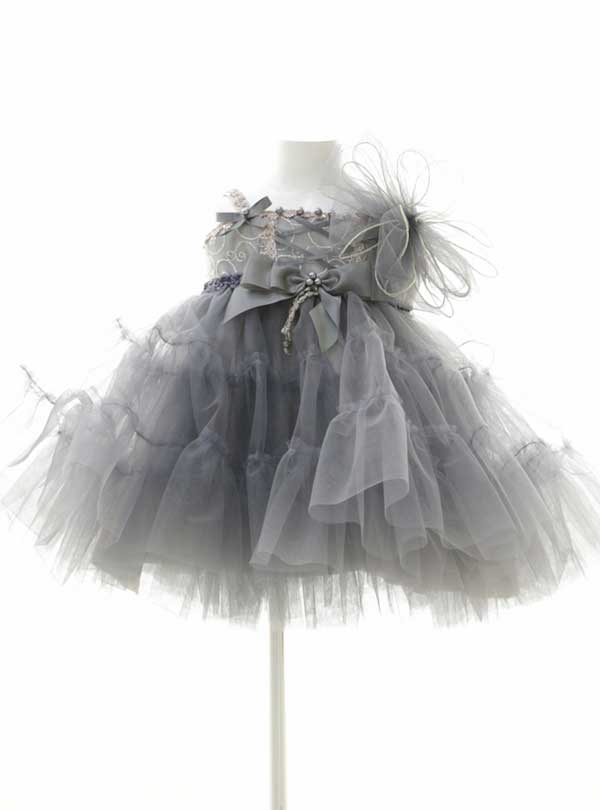 胸元のリボンやグレーパールがとても上品で華やかな大人っぽいデザインです。高い位置に切り替え部分があるのでスカート部分が広がりボリュームがでて豪華な印象です。 色味はダークグレーでシックな雰囲気なので、クールな兄弟姉妹撮影をご希望の方はブラックコーデがおすすめです。グレージュの背景にぴったりです。