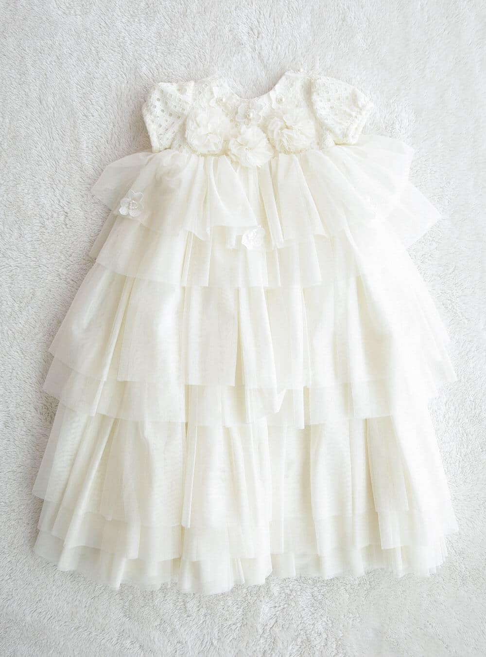 アイボリーのお色味がナチュラルな雰囲気のドレス。胸元には繊細なレースがあしらわれており、お花のコサージュが顔周りを華やかに演出してくれます。チュールレースを何層にも重ねたっぷりとギャザーを取り、ふんわりとしたシルエットの豪華なドレスは赤ちゃんの晴れの日を彩ります。 素朴で自然な雰囲気がお好みの方にオススメです。