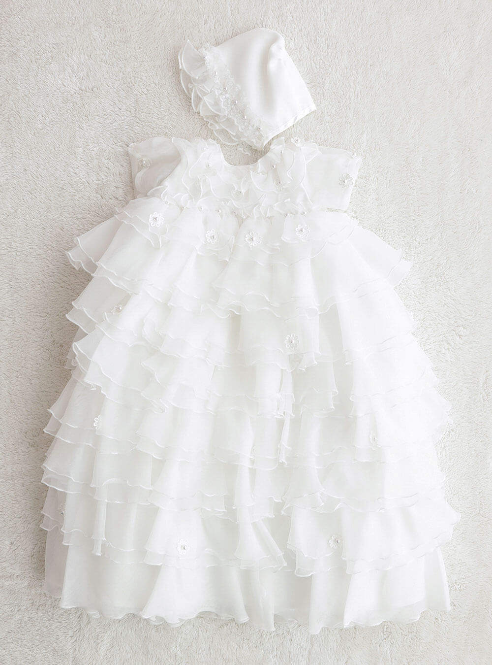 幾層にも重なるレースが特別感を演出してくれる上品で清楚な雰囲気のドレス。繊細なレースときらびやかなパールがところどころに散りばめられており、赤ちゃんのお顔を華やかに演出してくれます。手触り滑らかなオーガンジーの素材感で、おそろいのボンネットを合わせればさらに豪華な印象に。 清らかな純白のドレスは男の子女の子にも人気です。
