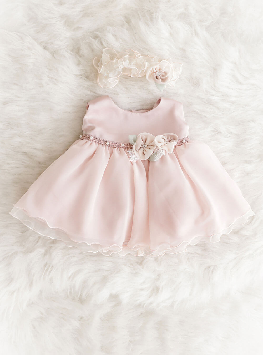 このベビードレスは、淡いピンク色が可憐で優雅な雰囲気を漂わせる一着です。ウエスト部分に施された繊細なフラワーアクセントが、ドレス全体に華やかさを添えています。軽やかな素材で作られたスカート部分は、ふんわりと広がり、お子さんをより一層愛らしく引き立てます。 ヘッドバンドもセットになっており、統一感のあるコーディネートが完成します。お祝いの席や記念写真にピッタリな、このドレスは特別な日の思い出をより一層輝かせてくれるでしょう。