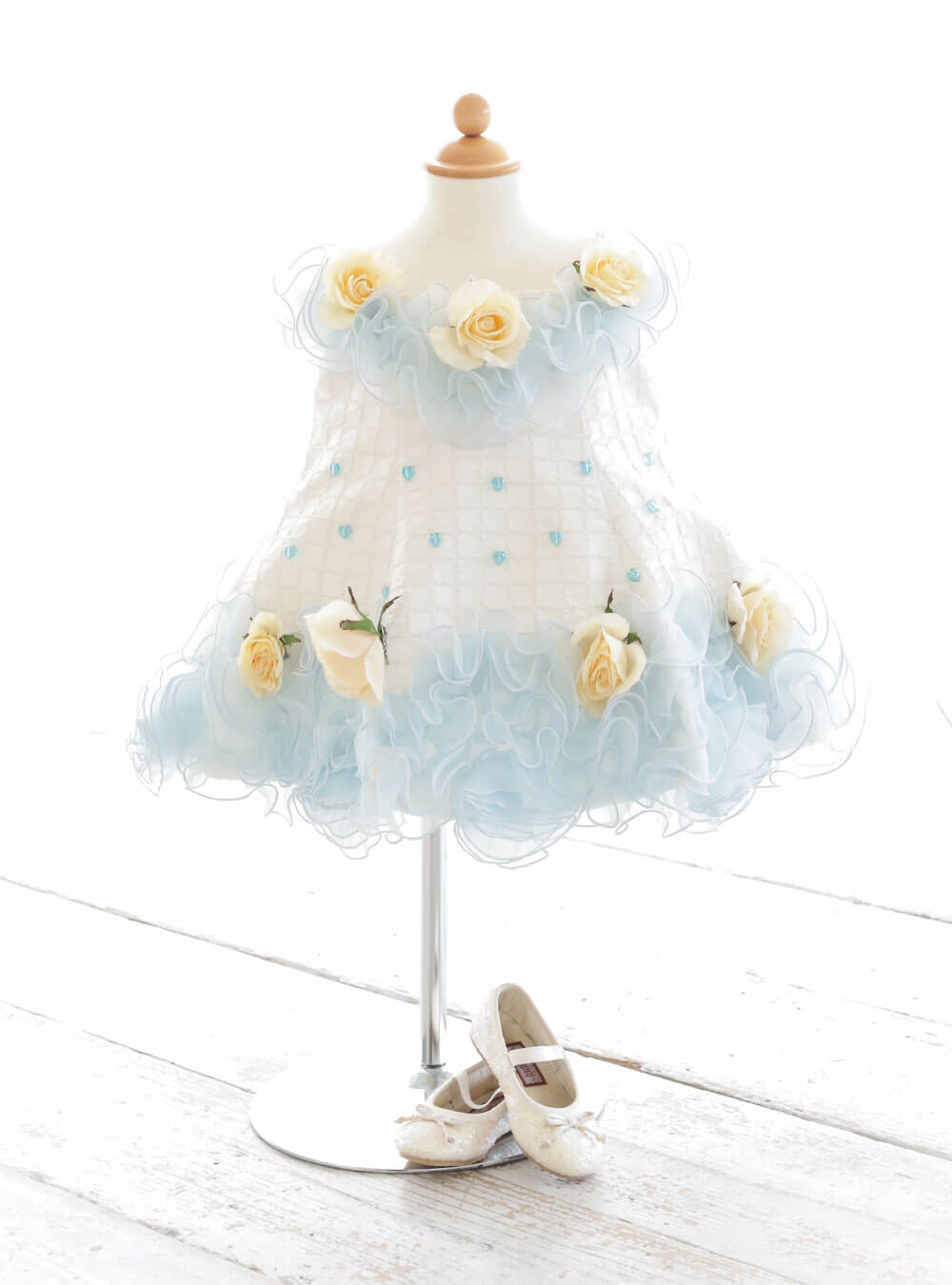 淡いブルーとクリーム色の薔薇がふんわりとしたフリルの縁に美しく配置されており、繊細な刺繍がドレス全体に華やかさを加えています。 軽やかな素材が優しく広がり、着るお子さんに無邪気なエレガンスを与えます。特別なイベントでまるでお姫様のような気分にさせる一着です。