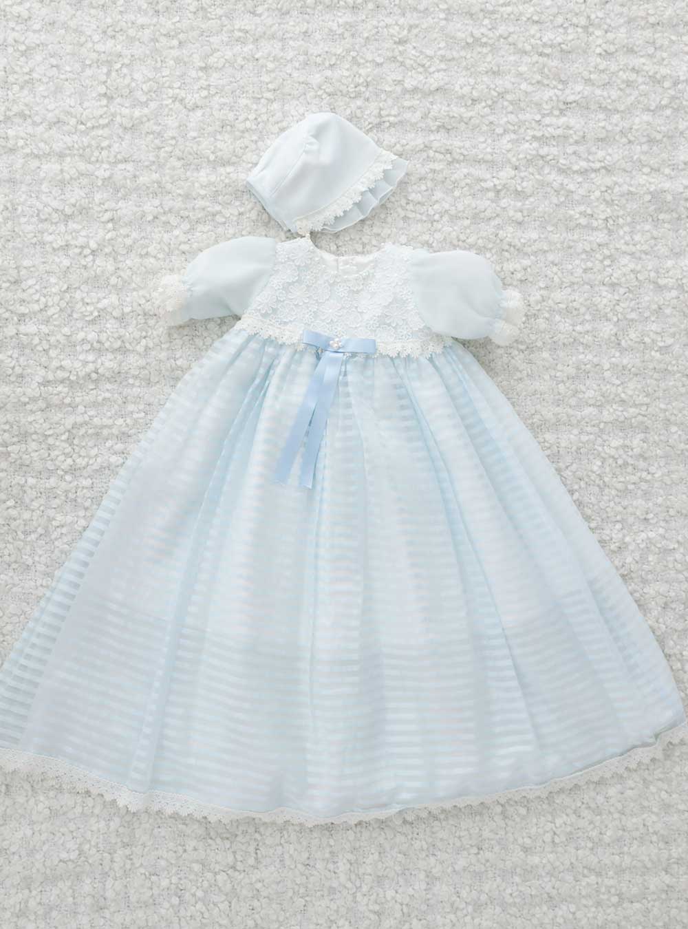 淡い水色が可愛らしいドレスです。上身頃には花模様のレースが使用されとても上品な印象です。セットの帽子や袖口にもレースが施されています。スカート部分はボーダーラインのデザインで透け感のある生地感でふんわりと優しい雰囲気です。切り替え部分のリボンにはパールが付いておりポイントになっています。シンプルなデザインなので男の子にも人気の1着です。
