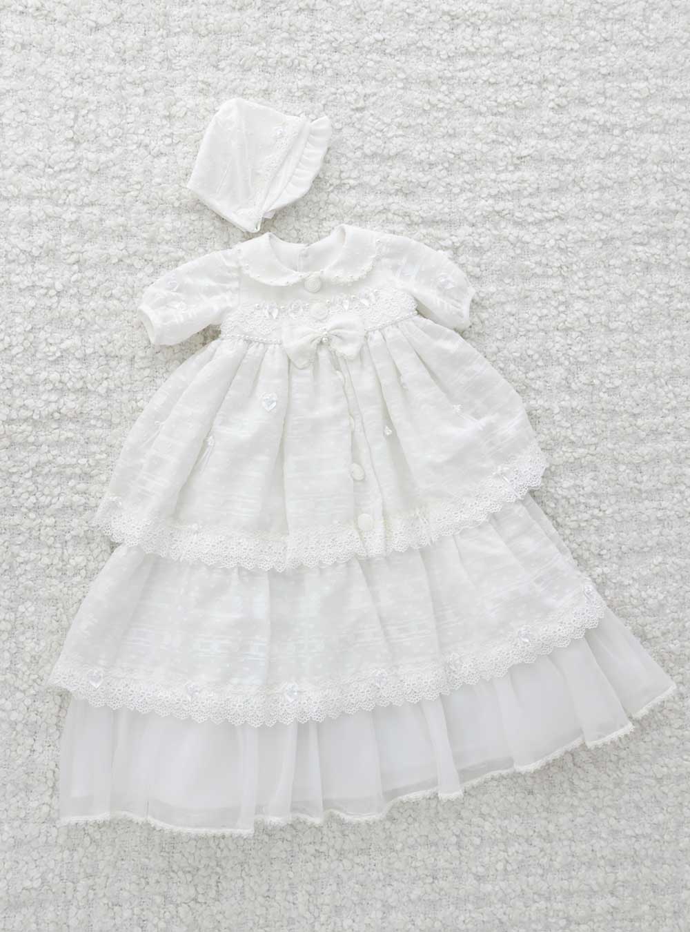 フリルの丸襟が可愛いベビードレスです。ドレスのラインは長めの3段フリルになっています。胸元の大きなリボンとまん丸のクルミボタンがポイントのナチュラルなドレスとなっており、フリルのレース部分はリボンがデザインされているのでとてもキュートな印象です。 クラシカルな雰囲気が好きな方におすすめです。