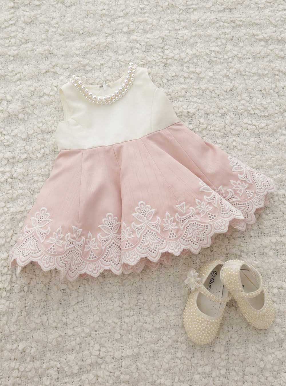 白、ピンクがメインカラーのドレスです。スカートの部分にレースの刺繍があり、首元にはパールがデザインされているのでとても女の子らしい衣装です。ウエストで切り替えのあるAラインのデザインで座ったポーズのときもスカートがきれいに広がるので人気のデザインです。 ファスナータイプでお着替えもしやすいです。パールのついたヘッドドレスと合わせるとよりドレッシーになるのでおすすめです。