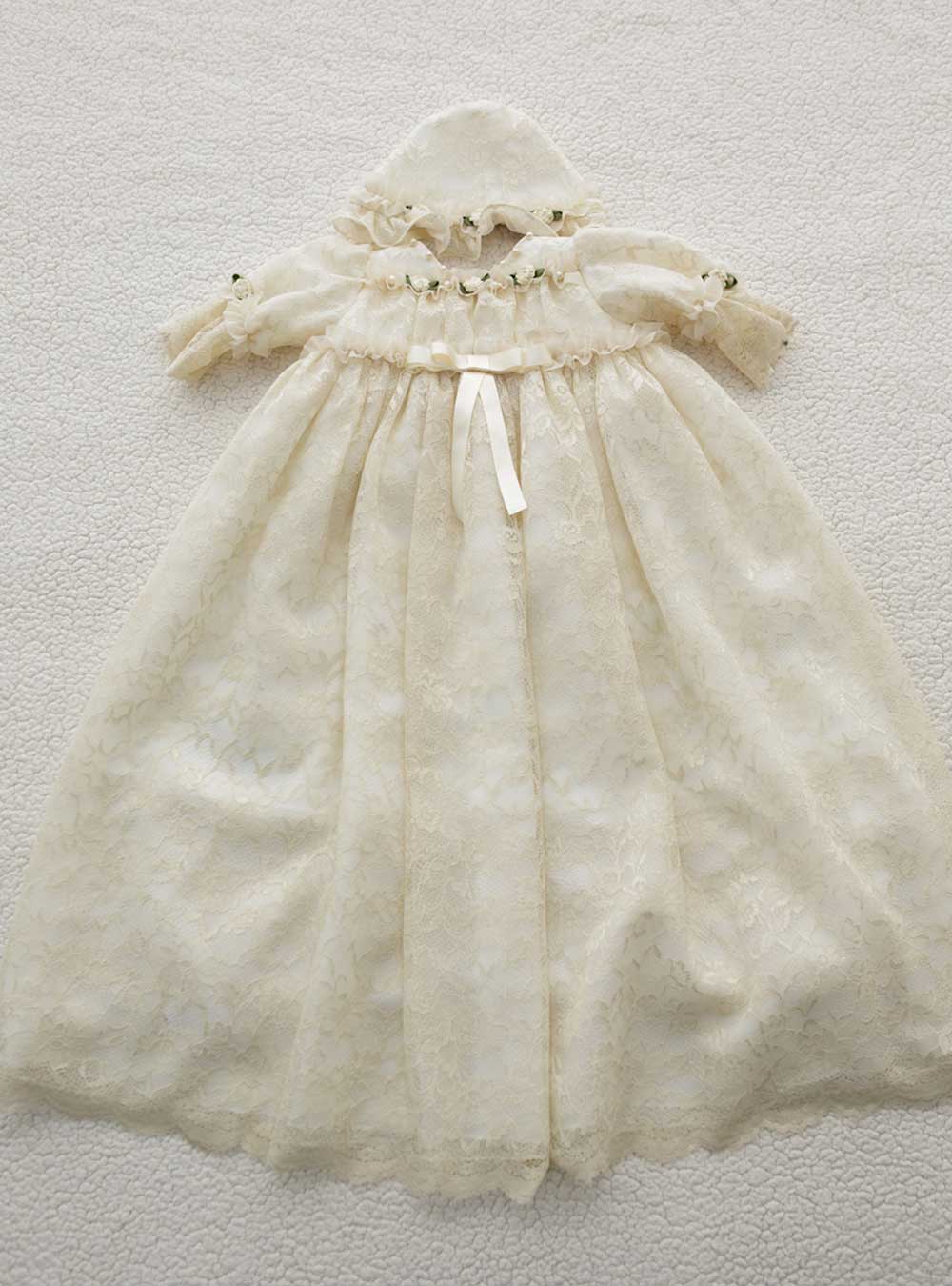 アンティーク調のレース生地で高級感のあるデザイン。繊細な総レースに薔薇の装飾がアクセントになり上品なドレス。肌馴染の良いベージュカラーがナチュラルで優しい印象にしてくれます。 男の子にも女の子にもお召いただけるカジュアルな家族写真にもフォーマルな家族写真にもマッチするセレモニードレスです。