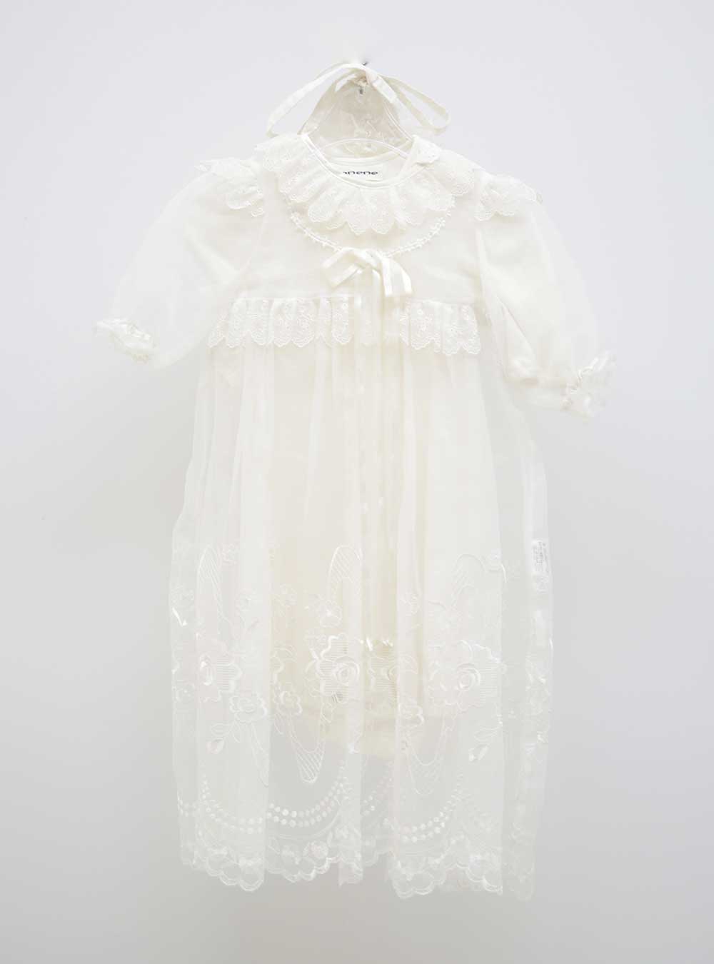 裾の長いデザインが多い中、他のベビードレスよりは少し丈が短めなのが特徴でナチュラルなシンプルデザインのベビードレスです。ウエストや首元のフリルがオシャレで可愛い♪ セットの帽子以外にもヘッドアクセは大ぶりのお花・少し控えめなデザインのヘッドバンド・帽子など何でも相性抜群です!男女兼用で着用いただけます。