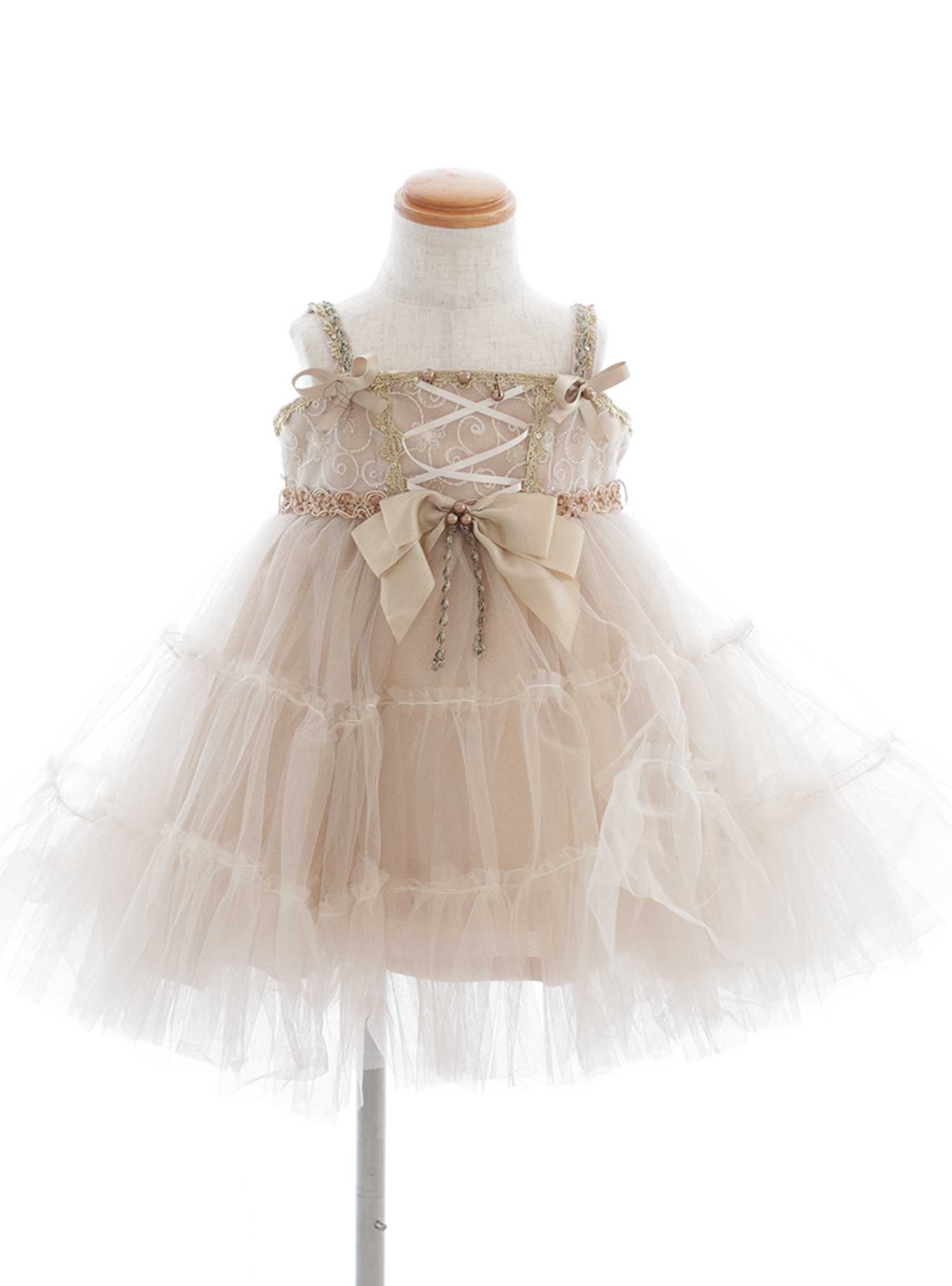 今人気のベージュカラーで今時のオシャレを取り入れつつ、形やデザインはしっかりとしたプリンセスラインドレス! 細めのショルダーで赤ちゃんらしいムチッとした腕が見えるのも嬉しいポイント! スカート部分のチュールはとても軽いので動くたびにフワッとなびいてとても綺麗です。スタジオ背景はどんな背景でも合わせやすいのでオススメです♪