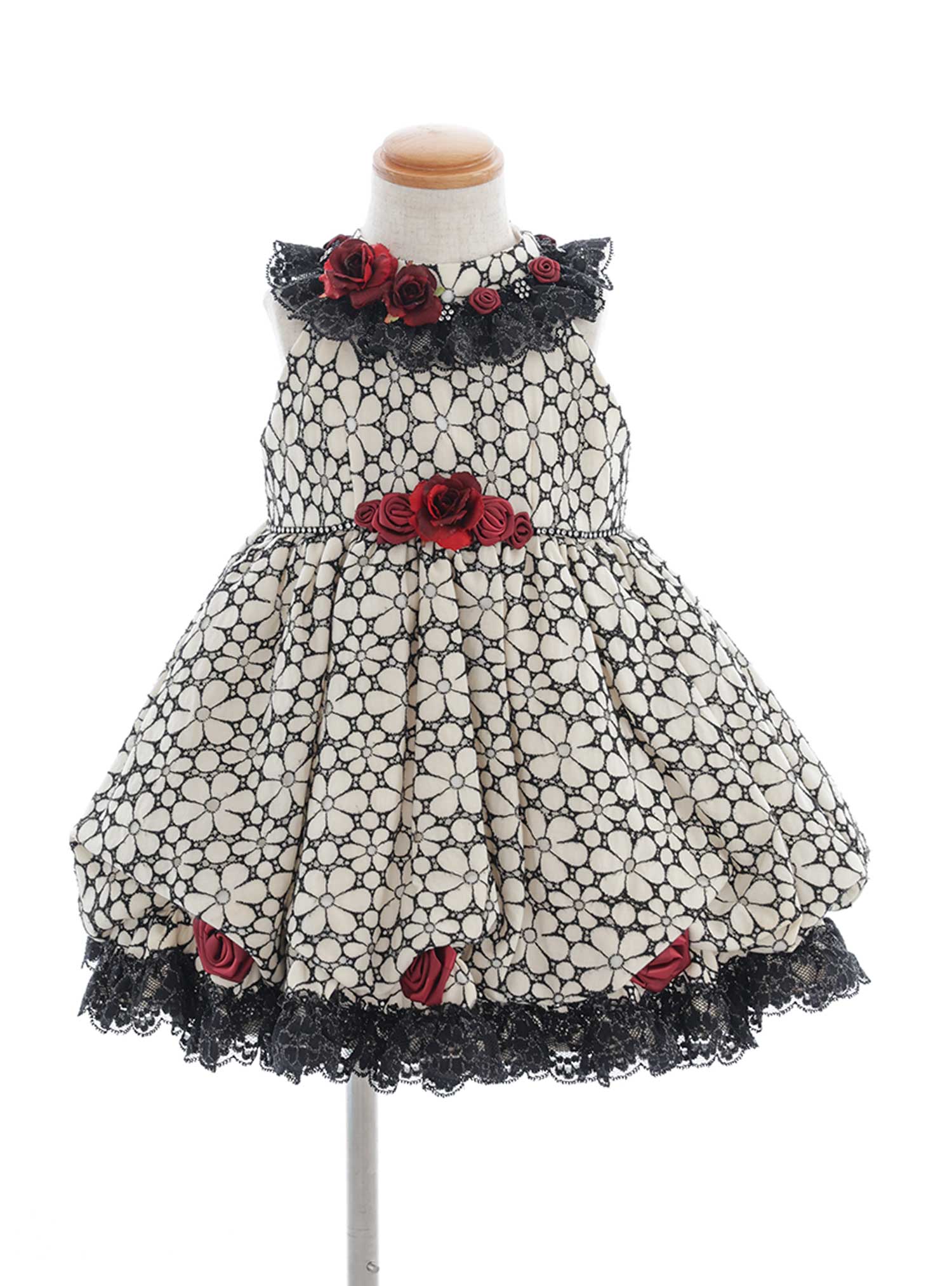 黒と赤の組み合わせが上品で華やか!白生地に黒の花柄刺繍が沢山施されていて、首元と裾にはレースフリル、所々に付いた赤のバラが一際際立つゴージャスなデザイン! ヘアアクセや靴はドレスに合わせて赤や黒で統一するとまた素敵なトータルコーディネートの出来上がり♪ 今日が主役!の誕生日撮影や特別な日などに相応しいドレスです♡