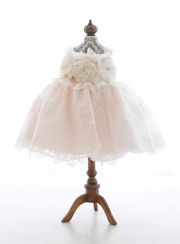 胸元に施された立体感のあるバラがモチーフのドレス。王道のプリンセスドレスです。所々パールが散りばめていて華やかさを演出。 チュール生地のボリュームたっぷりのスカートは、レース柄やドット柄がデザインされており、女の子らしさ満点の1着です。